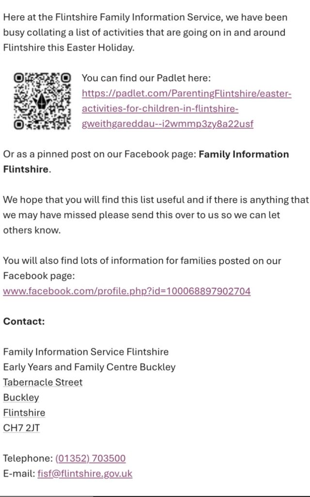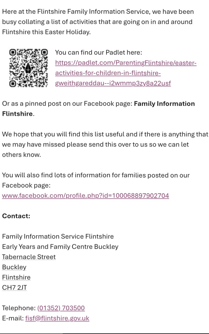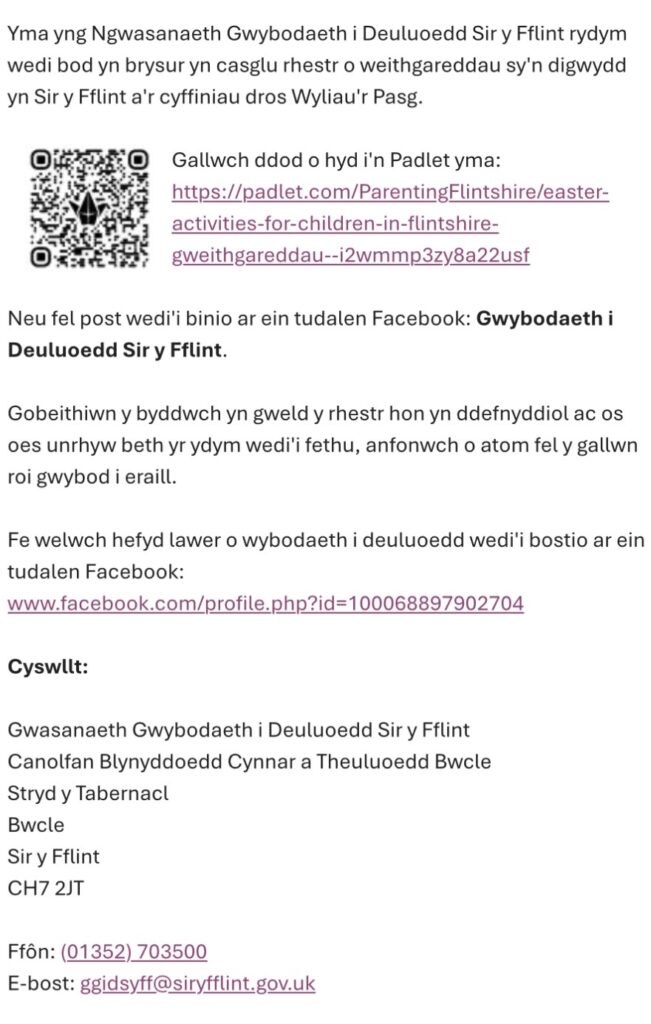 Gweithgareddau Gwyliau Pasg | Easter Holidays Activities https://padlet.com/ParentingFlintshire/easter-activities-for-children-in-flintshire-gweithgareddau–i2wmmp3zy8a22usf